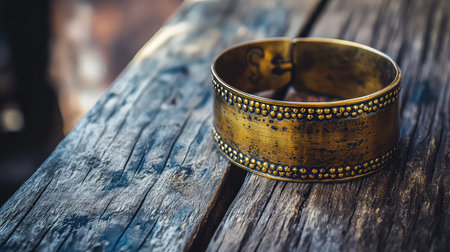 A striking close-up image featuring an ornate bronze bracelet displayed on a rugged wooden surface, highlighting intricate patterns and rich textures.