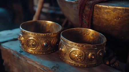 This image features two stunning vintage bracelets made of intricately designed gold metal, resting on a rustic wooden surface, showcasing exquisite craftsmanship.