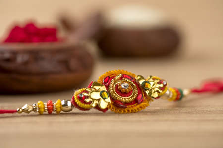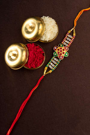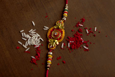 Indian festival: Raksha Bandhan background with an elegant Rakhi, Rice Grains and Kumkum. A traditional Indian wrist band which is a symbol of love between Brothers and Sisters.