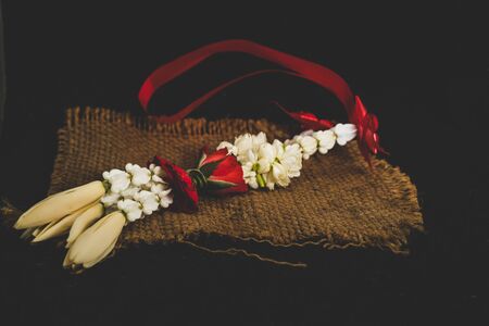 A selected focus Thai traditional jasmine garland. symbol of Mother's day in thailand, to offer the monk or buddha in dark background.