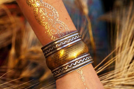 Manicured hands of young Indian woman wearing many beautiful golden bracelents and bright embroideren sari dress