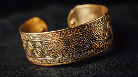 This stunning gold bangle features intricate geometric patterns and a luxurious finish, perfect for accessorizing any elegant outfit or gift occasion.