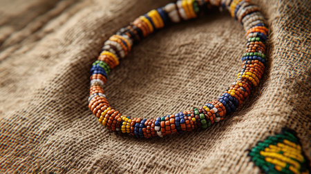 This captivating image features a colorful handwoven bracelet beautifully placed on a vibrant textile, showcasing intricate patterns and rich cultural craftsmanship, perfect for highlighting traditional artistry in jewelry.