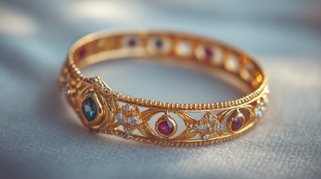 This stunning gold bracelet features vibrant gemstones and intricate detailing, showcasing exceptional craftsmanship and timeless elegance for any occasion.