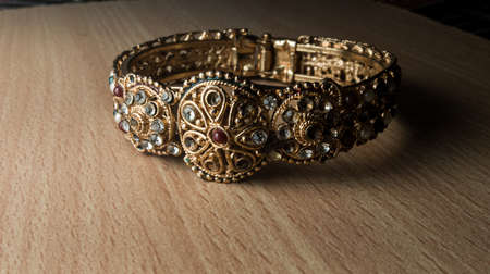 View of golden bangles which is common ornament worn in India. Shiny bracelet jewelry with stones and design works