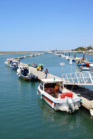 Visitors explore the dock in Faro, Algarve under clear skies. Boats are lined up in the water near the historic old town and Ria Formosa area