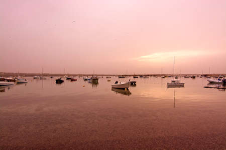 Seascape sunset with fishing boats in Cabanas de Tavira.