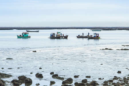 View of boats in the bay at low tide on the beach in the Mediterranean Sea on the island of Djerba, Tunisia