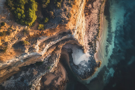 Aerial of Scenic Ponta da Piedade of Lagos, Portugal. Rugged seaside cliffs and aqua ocean waters in the Algarve region of Portugal