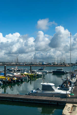 Boats moored along pontoons in the marina, Olhau, Algarve, Portugal, Europe.