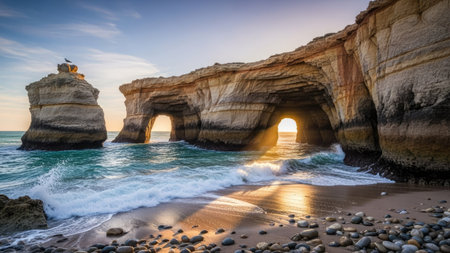 Dramatic coastal landscape features natural arch formations and incoming waves. The scene is bathed in warm sunlight, creating contrasting shadows and highlighting textures. Suitable for illustrating travel, environment themes, or general visual interest for various commercial applications.