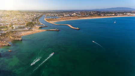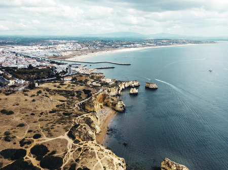 Aerial view from the sky of the Portuguese coastline of the Algarve zone of Lagos city. Boats and ships are moving in the direction of the port. High quality photo