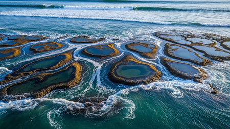 An aerial perspective reveals a series of natural rock formations with distinct tide pools filled with clear turquoise water, bordered by the ocean and crashing waves.
