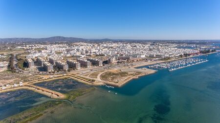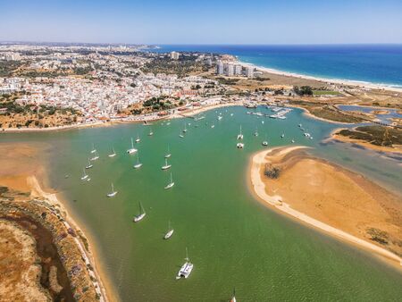 Aerial view of bay with yachts and city of Alvor, Algarve, Portugal