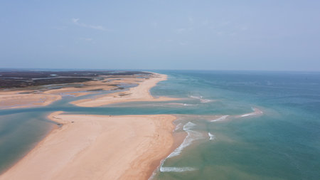 Aerial view of tranquil beach with golden sand, turquoise waters, and lush greenery, showcasing natural beauty and serene atmosphere. Tavira Portugal Algarve