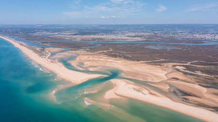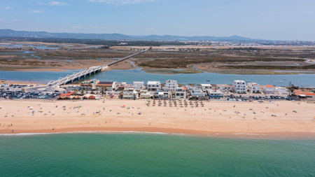 Aerial view shows the sandy beach at Praia de Faro and the Ria Formosa in Portugal. Visitors enjoy the beach while boats are seen in the water