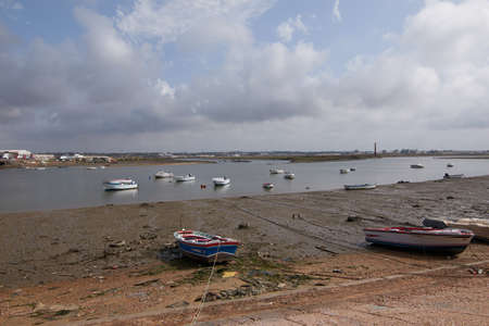 Fishing boats on the shore of Gilao river at Tavira, Portugal.