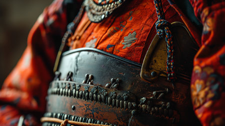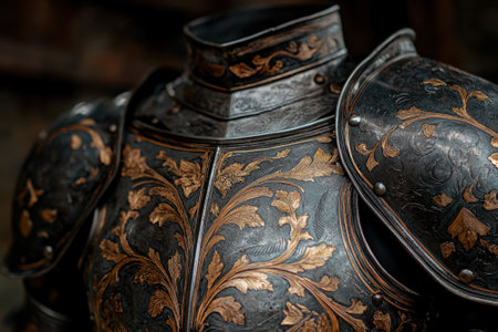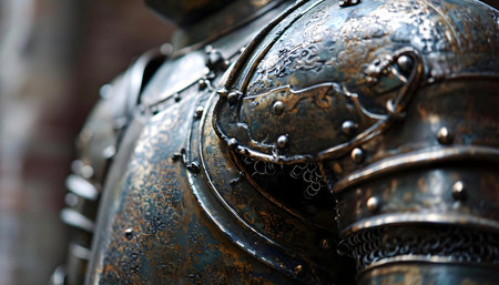 A detailed close-up of a weathered medieval armor suit, showing the intricacies and craft of ancient warfare.