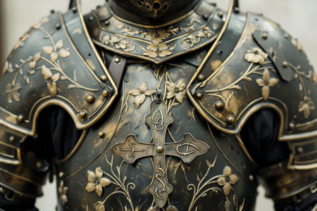 A person is wearing a gold and silver armor with a cross on it. The armor is decorated with flowers and has a gold and silver color