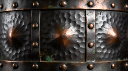 A creative digital illustration depicting Elegant professional stock illustration of hammered dark metal surface with patina accents, close-up hammered details, industrial chic lighting, bold upscale presence, gunmetal and copper hints, artis. This AI-generated artwork features unique visual elements suitable for various commercial and editorial applications. AI-generated illustration.