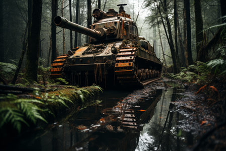 A small model of a military tank is positioned amid colorful autumn leaves in a striking forest background.