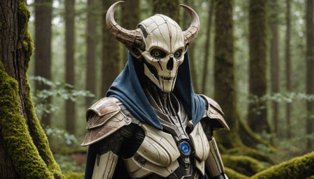 A robotic warrior stands in a forest, wearing a skull-like mask and armor