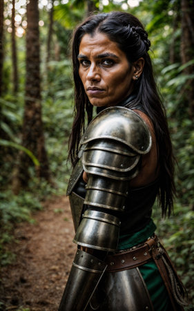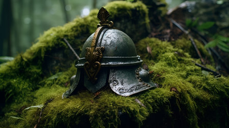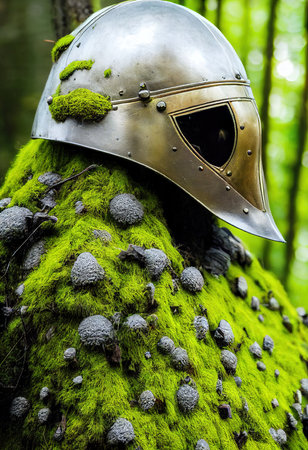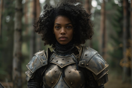 A powerful warrior in full armor pictured in a forest setting. AI-generated.