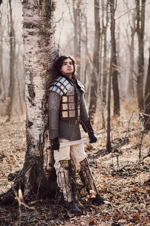 Brave medieval knight on the forest. Portrait of strong armed man on blurred background. Generative AI