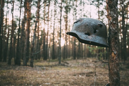 Damaged By Bullets And Shrapnel Metal Helmet Of German Infantry Wehrmacht Soldier At World War II. Rusty Helmet Hanging On Tree Trunk.