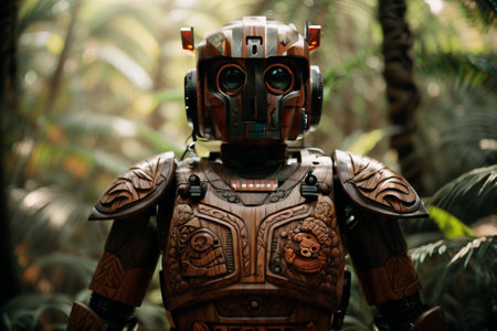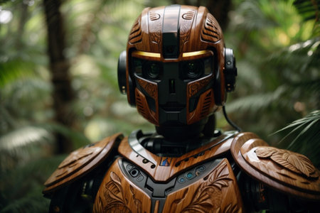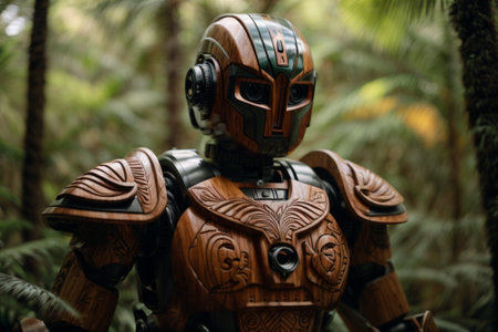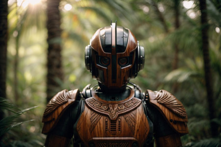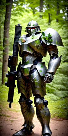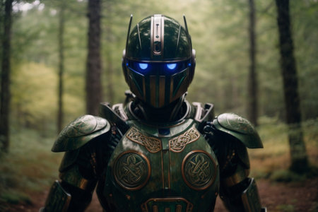 Futuristic armored robot with glowing lights in forest setting at dusk. Advanced technology and artificial intelligence concept