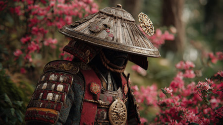 A warrior dressed in ornate armor stands quietly surrounded by vibrant blooming flowers.