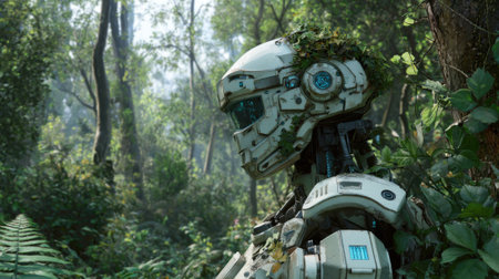 A robotic figure stands silently in a vibrant forest, covered in leaves and greenery. Sunlight filters through the trees, highlighting the fusion of technology and nature.
