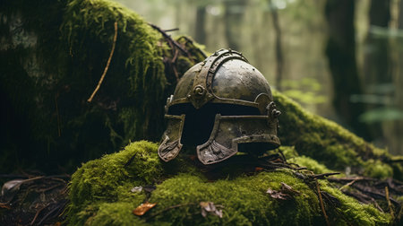 Defeated in battle medieval knight with armor lies on battlefield among forest.