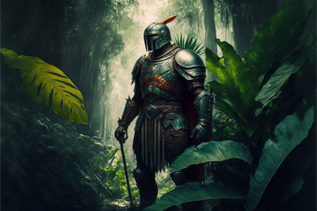 Fantasy knight with old armor in the ancient forest. Generative AI illustration