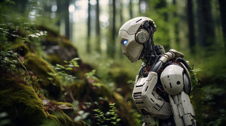 Close-up portrait of a futuristic robot in the forest. Fantasy concept.