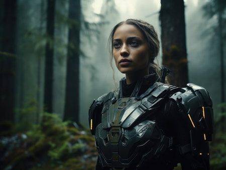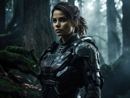 Warrior in green armor in the forest. Fantasy and futuristic concept.