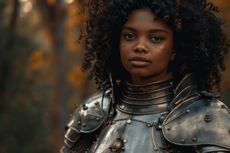 Inspire awe and admiration with a compelling picture of a muscular and stunning woman wearing resplendent armor.