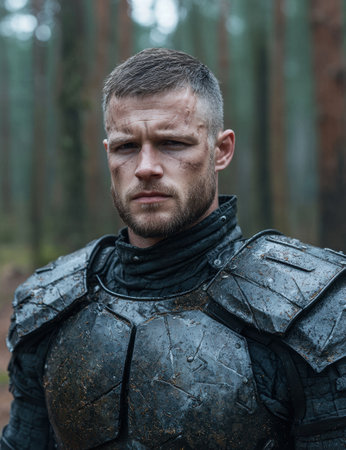 A medieval knight in armor, standing in a rainy forest, perfect for fantasy adventure themes.