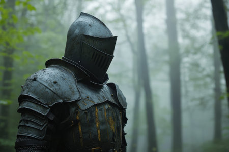 A knight in worn armor surveys a foggy forest, embodying a sense of mystery and ancient value amidst nature.