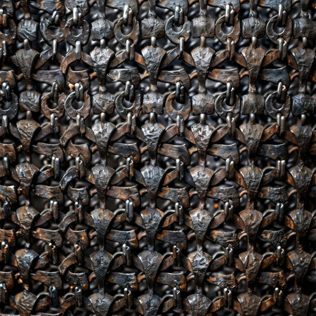 A detailed close-up of a weathered medieval armor suit, showing the intricacies and craft of ancient warfare.