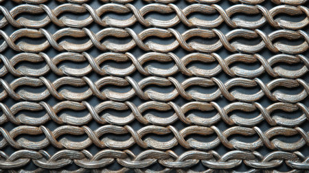 An intricate arrangement of interlocking metallic chains forms a visually striking pattern. The shiny texture reflects light beautifully, ideal for design projects.