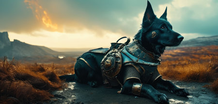 German shepherd in armor sitting on the sand at sunset. 3d rendering