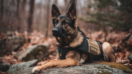 A German Shepherd dog is the main subject, resting on a stone surface. The dog has brown and black fur. The forest background exhibits blurred trees, fallen leaves, and rocks, bathed in diffused light, suggesting an autumn day. This image could be suitable for various commercial or editorial applications.