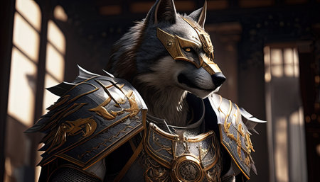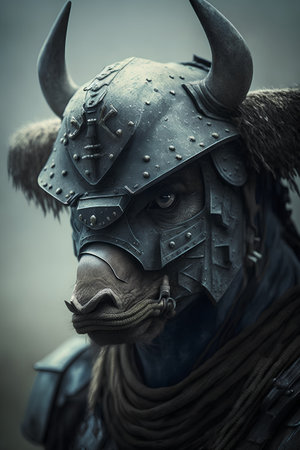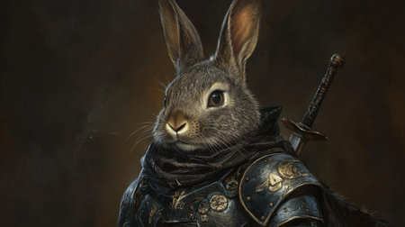 Digital painting of a rabbit wearing medieval armor and carrying a sword. Dark fantasy style, strong character.