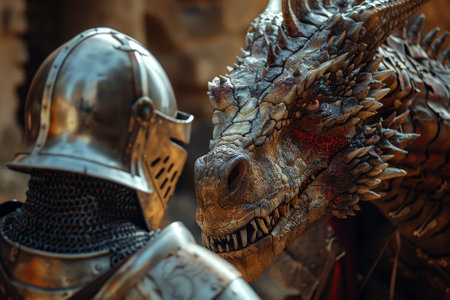 A knight is facing a dragon with a menacing look on his face. The knight is wearing a suit of armor and a helmet