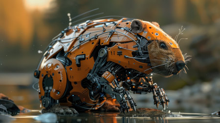 A beaver robot with cyber tools, symbolizing Canada, constructing a digital dam.