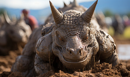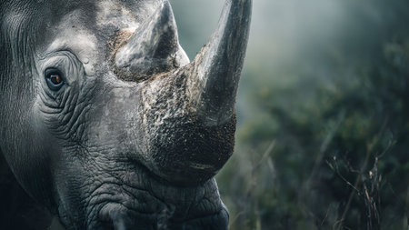 Close-up portrait of a rhino in its natural habitat. Majestic animal with a powerful horn. Wildlife conservation concept.