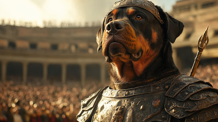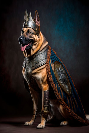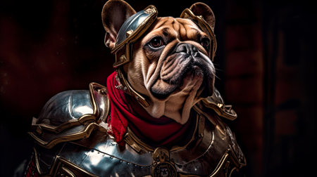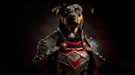 Surreal artwork with medieval knight, warrior headed of dogs head wearing armour isolated over dark vintage background. Comparison of eras, history. Contemporary artcollage