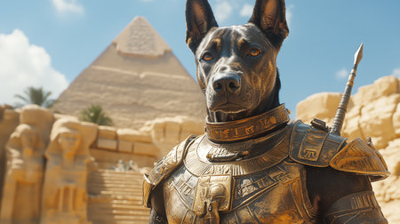 Close-up portrait of a dog in front of the pyramids of Egypt