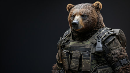 A conceptual portrayal of a bear equipped with a modern camouflage tactical vest, merging wildlife with military imagery.
